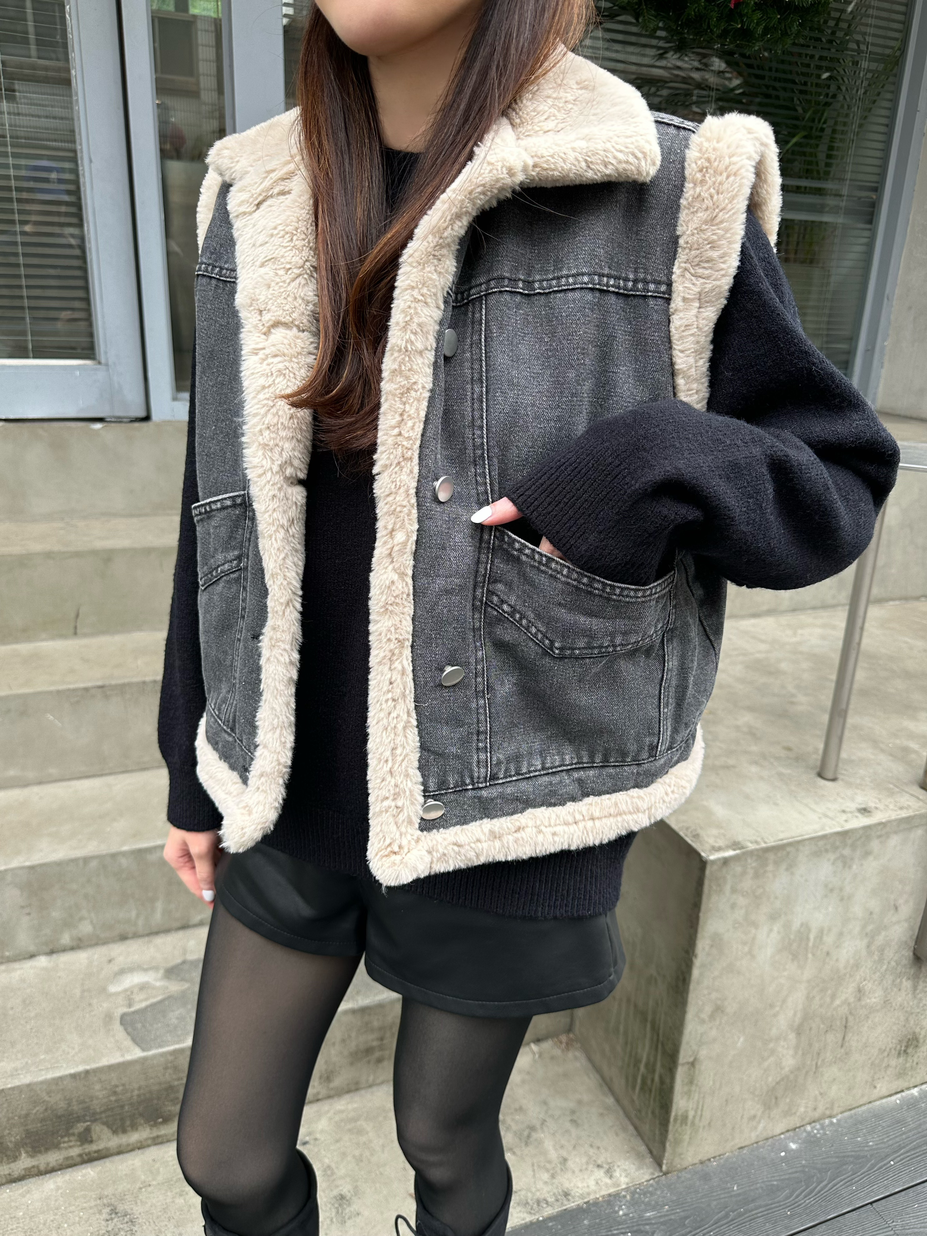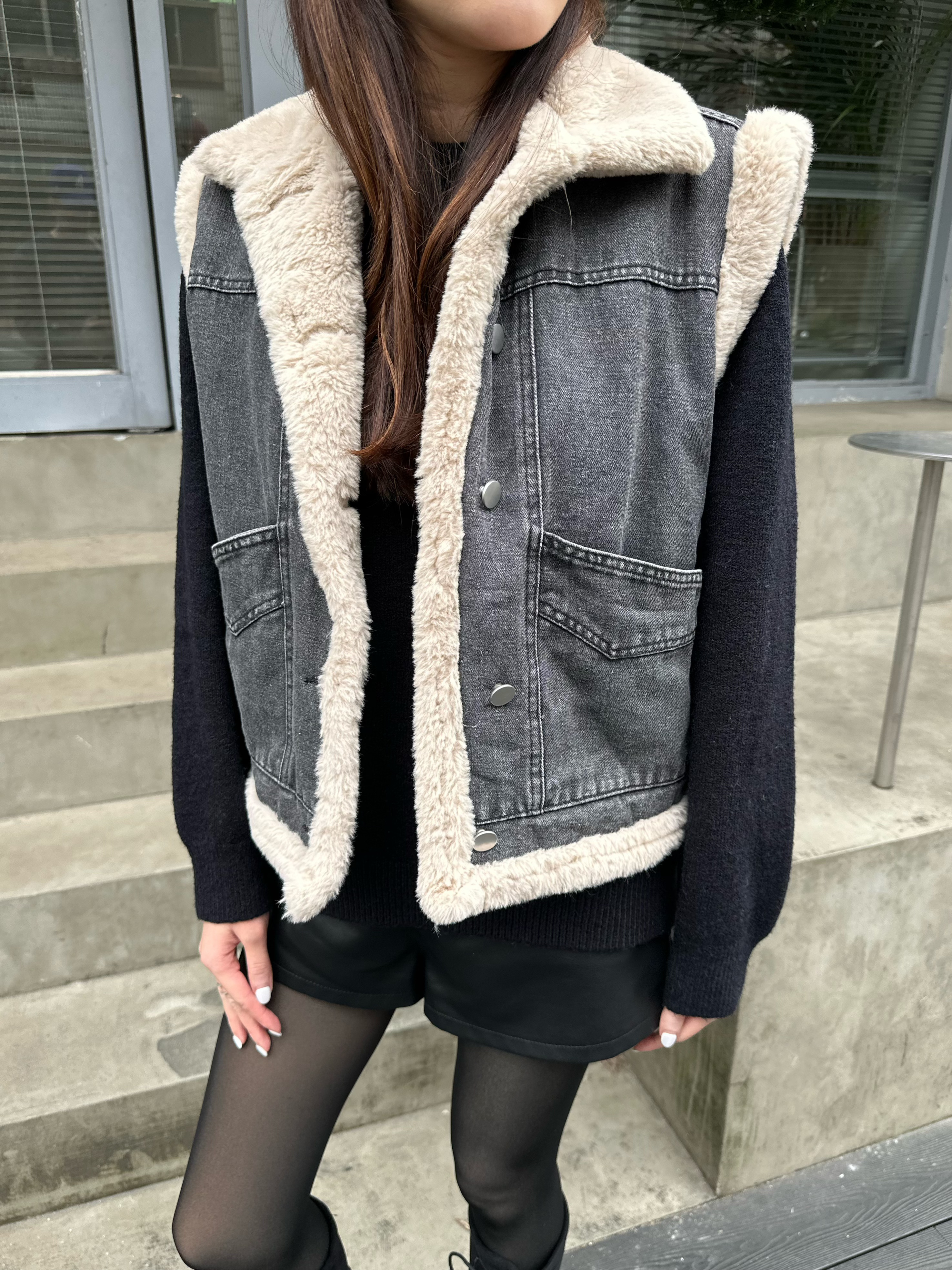毛毛灰色單寧背心